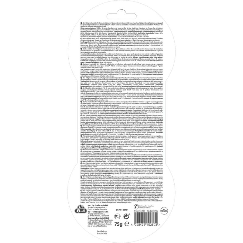 Lo snack 8IN1 Delights Sticks 3Pz è adatto ai cani di taglia piccola e media, consigliato per i cani dal peso compreso tra i 2 e i 35 kg, è uno snack gustoso formulato con carne di pollo avvolta in dura pelle bovina Premium. Ideale come premio o come ricompensa. Lo snack è perfetto per la salute dei denti, esclusivo e brevettato, si prende cura dei denti. Riduce la placca e previene la formazione del tartaro. Appaga il naturale istinto di masticazione del cane. Divertimento duraturo, senza avanzi. Lo snack non andrà incidere sulla dieta del cane rovinandone il peso forma, in quanto ha solo il 2% di grassi. La formulazione è senza esaltatori di sapidità o coloranti artificiali. Ideali per cani di piccola e media taglia.