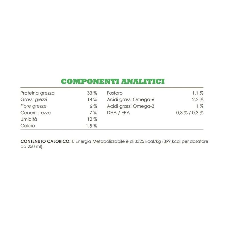 • Contiene il 65% di ingredienti animali, tra cui pollo da allevamento a terra, uova fresche e platessa pescata in natura.