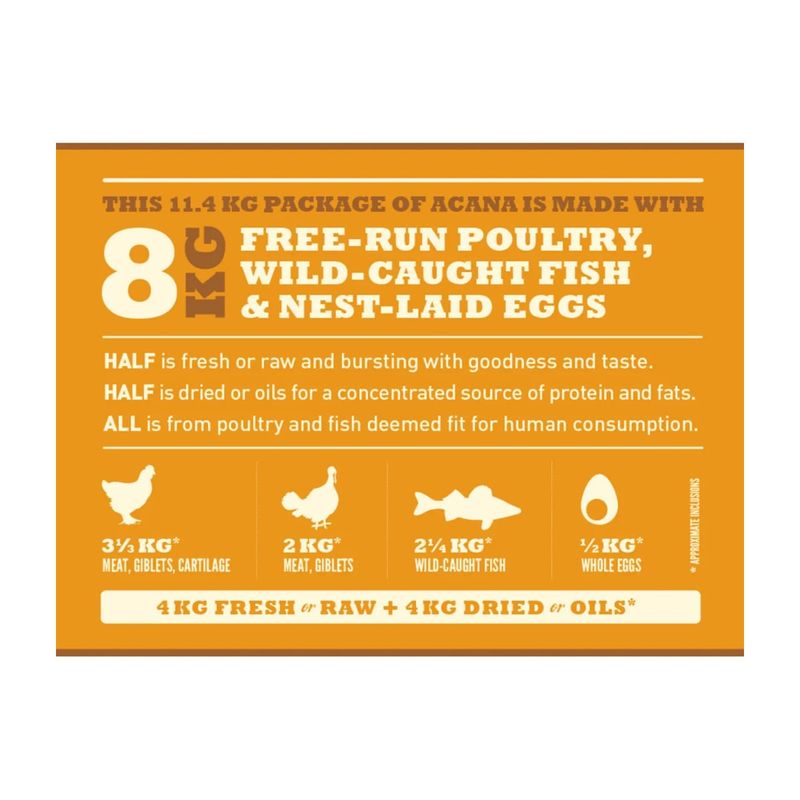 ACANA è un marchio di alimenti qualità premium per cani e gatti, nato oltre 25 anni fa nelle pluripremiate cucine Champion Petfoods. Qui vengono preparati ogni giorno alimenti biologicamente appropriati per cani e gatti, fatti con ingredienti regionali freschi e curati in ogni dettaglio della produzione. Le ricette di ACANA si basano sul principio del Biologically Appropriate e prevede la riproduzione di qualità, freschezza e varietà degli ingredienti animali che cani e gatti trovano in natura: un’alimentazione ricca di carne e proteine, con ridotto o assente contenuto di carboidrati, nessun estratto di proteine vegetali e l’integrazione di piccole percentuali di frutta, verdura, bacche e ingredienti botanici.