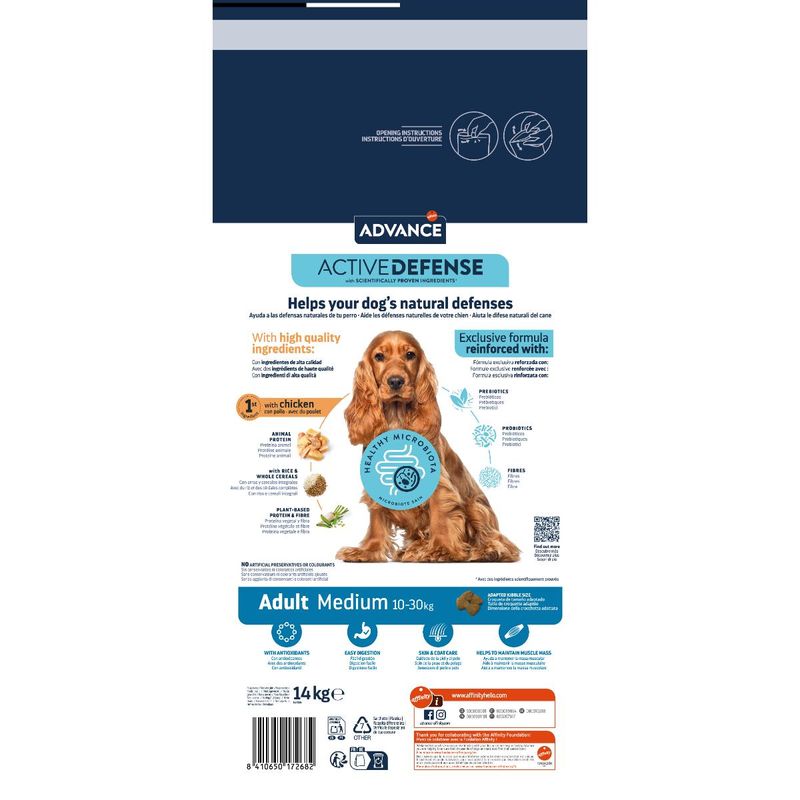Advance ActiveDefense Dog Adult Medium con Pollo è la scelta ideale per garantire al tuo cane adulto di taglia media un'alimentazione bilanciata e nutriente, supportando la sua salute a 360 gradi, dalla muscolatura alla pelle, dal pelo al sistema immunitario.