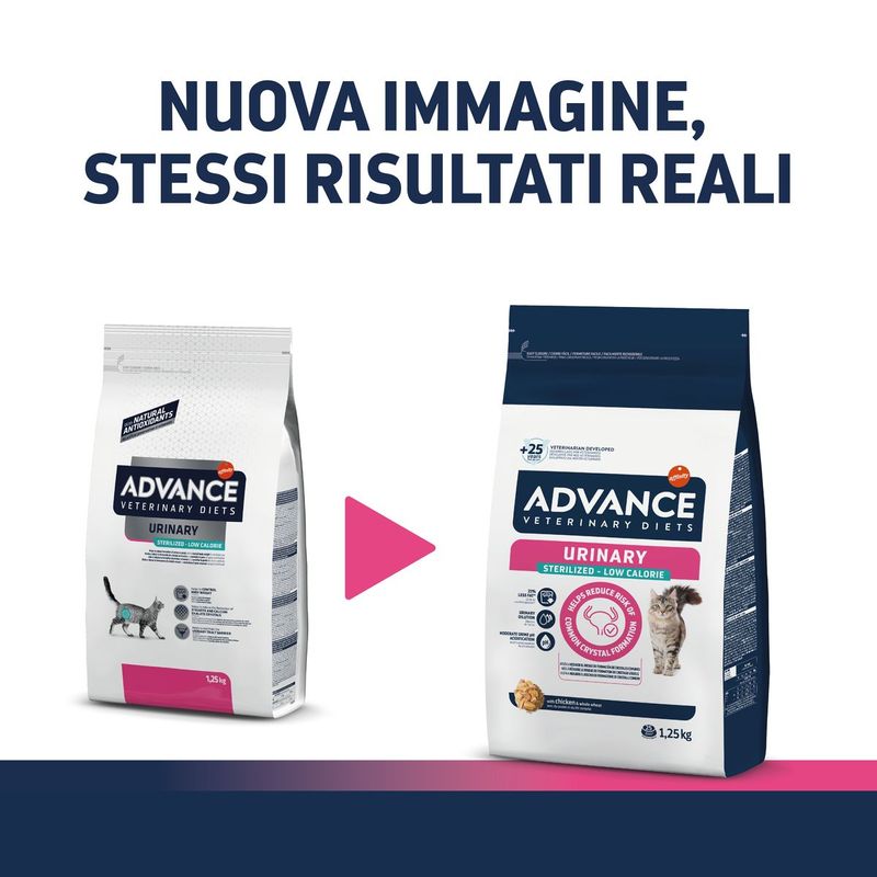 Advance Diets Cat Urinary Sterilized Low Calorie si rinnova con nuovo pack e nuova formulazione. Potresti ricevere il vecchio o il nuovo pack in base alla disponibilità in magazzino.