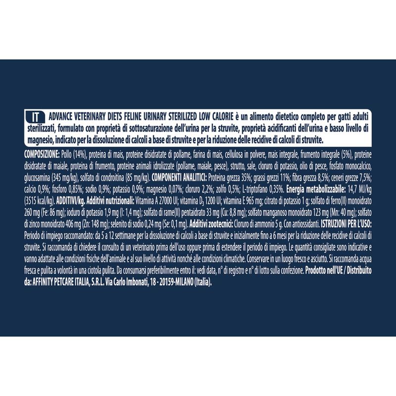 Advance Diets Cat Urinary Sterilized Low Calorie è un alimento dietetico completo per gatti adulti sterilizzati, formulato per controllare il peso e supportare la salute urinaria. Grazie al suo contenuto moderato di calorie e all’alto apporto di fibre, aiuta a mantenere il peso ideale nei gatti sterilizzati. Formulato con un livello moderato di magnesio e proprietà acidificanti dell'urina, è indicato per ridurre la ricomparsa di calcoli di struvite e ossalato, favorendo il benessere delle vie urinarie. Questo alimento è privo di coloranti e conservanti artificiali, per una dieta naturale e sicura.