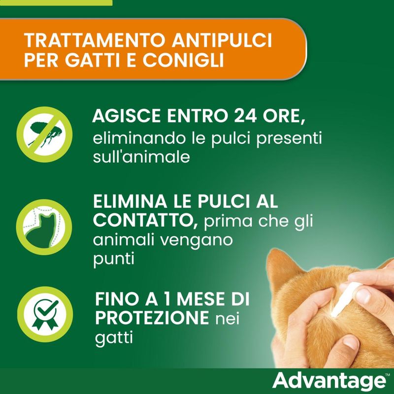 Il trattamento antipulci Advantage per gatti e conigli si applica direttamente sulla cute di gatto o coniglio e agisce entro 24 ore, eliminando in un solo giorno le pulci presenti sull’animale; un trattamento previene l’ulteriore infestazione da pulci per 3-4 settimane nei gatti e fino ad una settimana nei conigli. È una soluzione topica (spot-on) facile da applicare che uccide le pulci del gatto e del coniglio al contatto, prima che vengano punti. Advantage aiuta nella lotta contro le pulci.