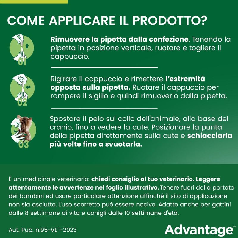 Advantage per gatti e conigli si applica sulla cute sotto forma di gocce. Il principio attivo si diffonde sulla cute dell’animale ed elimina le pulci al contatto. Non è quindi necessario che il tuo gatto venga punto perché il trattamento funzioni.