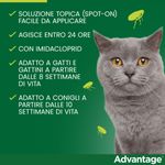 Il trattamento antipulci Advantage per gatti e conigli si applica direttamente sulla cute di gatto o coniglio e agisce entro 24 ore, eliminando in un solo giorno le pulci presenti sull’animale; un trattamento previene l’ulteriore infestazione da pulci per 3-4 settimane nei gatti e fino ad una settimana nei conigli. È una soluzione topica (spot-on) facile da applicare che uccide le pulci del gatto e del coniglio al contatto, prima che vengano punti. Advantage aiuta nella lotta contro le pulci.