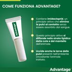 Advantage contiene imidacloprid, un principio attivo che elimina le pulci al contatto, infatti non viene assorbito dal sangue. Questo principio attivo si diffonde nello strato lipidico della cute e del mantello del gatto. Uccide anche le larve delle pulci presenti nell’ambiente circostante l'animale trattato: le larve infatti si nutrono dei detriti cutanei contenenti il principio attivo e saranno eliminate rapidamente, interrompendo il ciclo di vita della pulce.