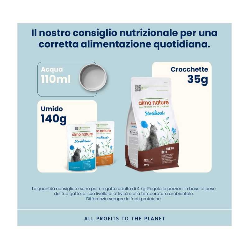 Almo Nature Cat Holistic Sterilised Manzo e Riso è un alimento secco completo, studiato per rispondere alle esigenze specifiche dei gatti adulti sterilizzati. Dopo la sterilizzazione, il fabbisogno calorico del gatto può diminuire fino al 30%, rendendolo più incline al sovrappeso a causa della ridotta attività motoria. Inoltre, i gatti sterilizzati tendono a bere meno, un comportamento che può portare allo sviluppo di calcoli nella vescica a causa della scarsa idratazione. Per evitare questi rischi, Almo Nature Holistic Sterilised offre un alimento con un basso contenuto di magnesio e un apporto di fibre adeguato per il controllo del peso, aiutando a mantenere il tuo micio idratato in modo naturale. Le ricette contengono il 26% di carne fresca di manzo, garantendo un pasto appetibile e nutriente, che soddisfa pienamente il fabbisogno nutrizionale del gatto con proteine animali di alta qualità e un mix speciale di cereali. Inoltre, questa formula è progettata per offrire una dieta completamente naturale, infatti le crocchette sono costituite da materie prime selezionate, di alta qualità e naturali, senza OGM, esaltatori di sapidità o conservanti artificiali, offrendo al tuo micio tutta la genuinità che solo un alimento completamente naturale può garantire.