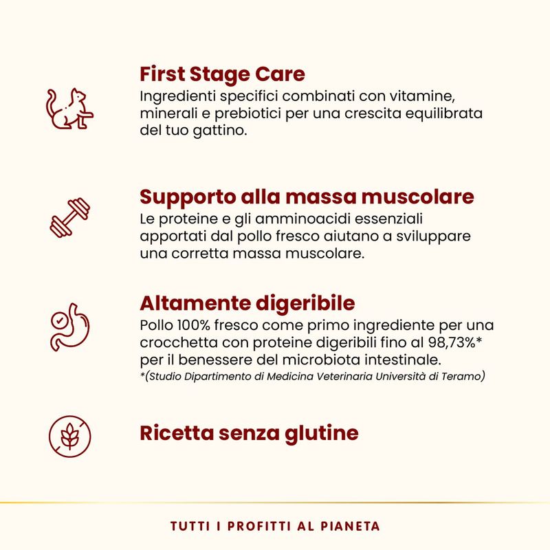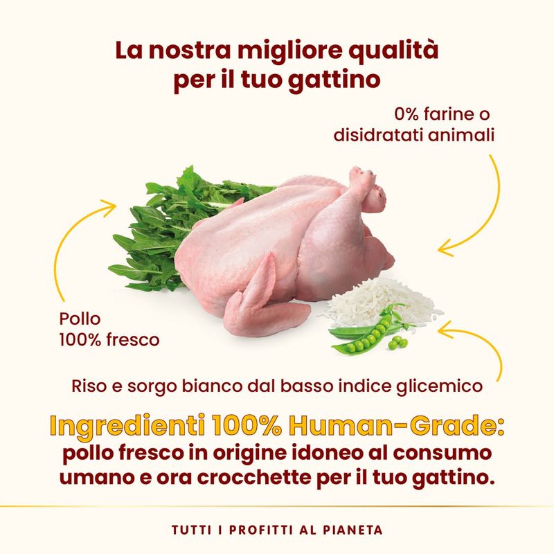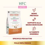 Almo Nature Kitten HFC Our Best Pollo Fresco sono un alimento secco completo studiato appositamente per i gattini in fase di crescita, ma perfetto anche per le femmine in gravidanza o allattamento. La loro ricetta esclusiva contiene 100% pollo fresco come unica fonte di proteina animale, altamente digeribile e ad alto valore biologico. Grazie alla formula monoproteica, aiuta a ridurre il rischio di intolleranze, mentre i prebiotici naturali (FOS e MOS) favoriscono il corretto sviluppo della flora intestinale, sostenendo la salute digestiva fin dai primi mesi. L’apporto bilanciato di minerali, amminoacidi e vitamine essenziali assicura una crescita armoniosa e completa. I cereali utilizzati sono naturalmente senza glutine, rendendo il prodotto adatto anche ai cuccioli più sensibili. E come sempre, senza conservanti né coloranti chimici, solo ingredienti puri e genuini, trattati il meno possibile per conservare tutto il loro valore nutrizionale.