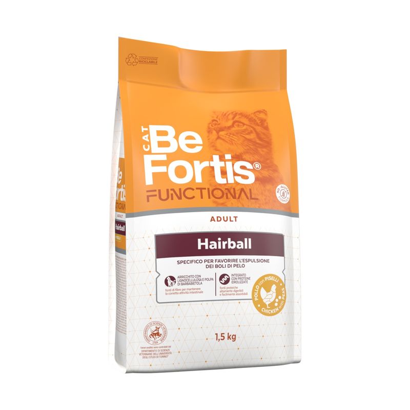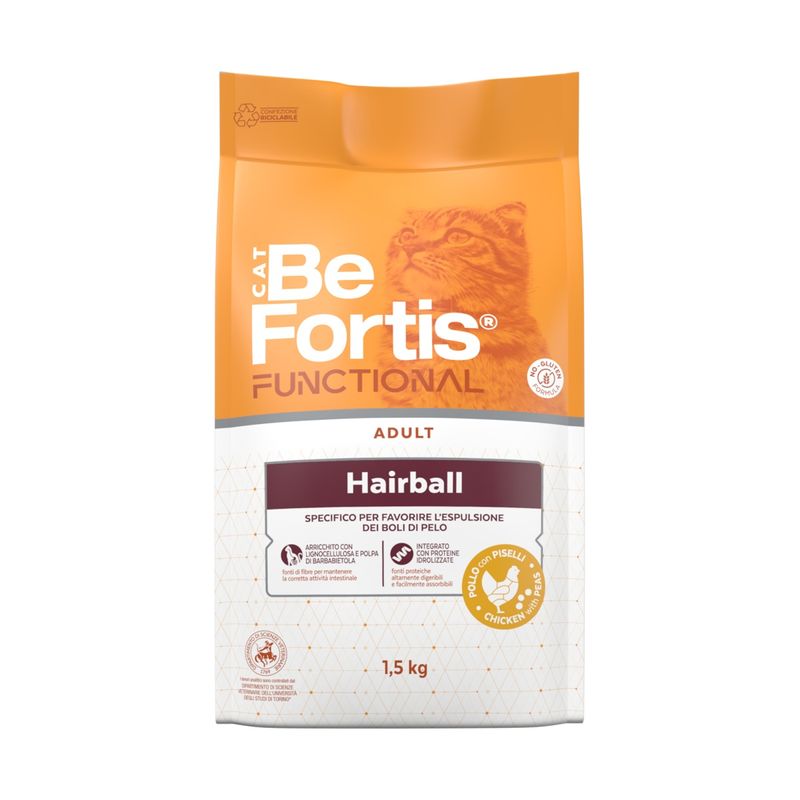 Il BeFortis Cat Adult Hairball è un alimento secco pensato appositamente per favorire l’espulsione naturale dei boli di pelo nei gatti adulti. Il target di riferimento è: gatti adulti soggetti alla formazione di boli di pelo, in particolare quelli con pelo medio-lungo. La ricetta contiene pollo fresco con piselli, unito a proteine idrolizzate altamente digeribili, per una nutrizione completa e gustosa. Il prodotto è arricchito con lignocellulosa e polpa di barbabietola, che favoriscono il corretto transito intestinale, e con olio di salmone, preziosa fonte di Omega 3, per mantenere pelle e pelo in salute. La presenza di prebiotici FOS e MOS sostiene le difese immunitarie e promuove la digestione, mentre la L-carnitina aiuta il metabolismo dei grassi e il controllo del peso. Il tutto in una crocchetta da 10 mm, perfetta per la masticazione felina. Il prodotto è senza glutine, quindi ideale anche per soggetti sensibili o intolleranti.