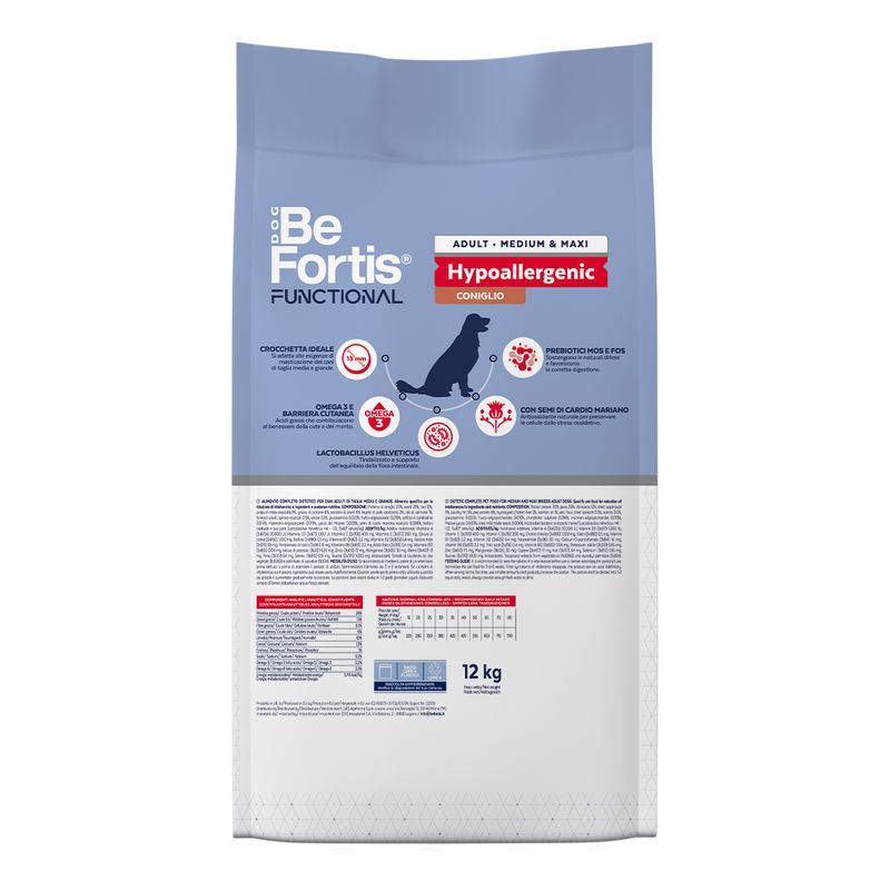 BeFortis Dog Adult Medium&Maxi Hypoallergenic Coniglio è un alimento secco completo appositamente formulato per cani adulti di media e grande taglia, progettato per rispondere alle esigenze dei cani con sensibilità cutanee e digestive in caso di intolleranze alimentari. Questo mangime ipoallergenico senza grano utilizza il coniglio come fonte proteica alternativa altamente digeribile, assicurando un'elevata tolleranza e riducendo il rischio di reazioni allergiche. La formula di BeFortis Hypoallergenic contiene carne magra e a basso contenuto calorico, ideale per mantenere il peso forma del tuo cane. Offre buone concentrazioni di Vitamina B3, essenziale per il metabolismo energetico, e minerali come fosforo, potassio e ferro, cruciali per la salute delle ossa, la funzione muscolare e la formazione dei globuli rossi. Questo alimento contiene prebiotici MOS e FOS, che sostengono le naturali difese immunitarie e favoriscono la corretta digestione, migliorando l'assimilazione dei nutrienti. Inoltre, il lactobacillus helveticus tindalizzato contribuisce all'equilibrio della flora intestinale, promuovendo una sana digestione e un sistema immunitario robusto. Questo mangime è arricchito con semi di cardo mariano, un potente antiossidante naturale che aiuta a preservare le cellule dallo stress ossidativo, e con acidi grassi omega-3, che contribuiscono al benessere della pelle e del manto. Questi componenti aiutano a mantenere la cute sana e il pelo lucido, migliorando l'aspetto e la salute esterna del cane. La crocchetta ideale di soli 16MM di diametro si adatta perfettamente alle esigenze di masticazione dei cani di taglia media e grande, facilitando l'ingestione e la digestione del cibo.