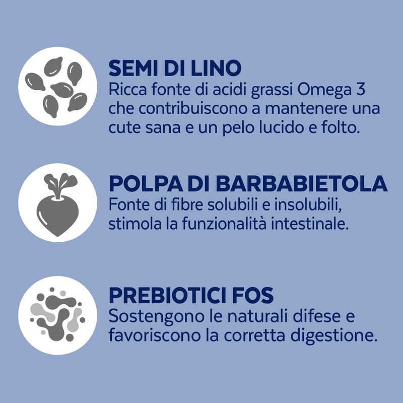 Con la polpa di barbabietola, ricca fonte di fibre solubili e insolubili, stimola la funzionalità e la capacità dell'apparato digerente, mentre i semi di lino, ricca fonte naturale di Omega 3 contribuisce a mantenere una cute sana e un pelo lucido e folto. Infine ci sono i prebiotici FOS che favoriscono un corretto equilibrio intestinale e sostengono le naturali difese, regolando la presenza dei batteri intestinali e sostenendone l'assorbimento corretto degli elementi nutrizionali.
