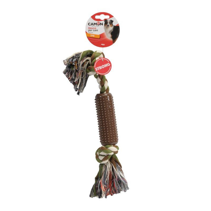 Sei alla ricerca di un gioco per cani che possa soddisfare le aspettative del tuo peloso? Offri al tuo amico quattro zampe un passatempo sano e divertente con Cotonosso per Cane con Cilindro in Tpr, un giocattolo per cani in corda con cilindro in TPR, dotato di punte di media dimensione, ideale per far divertire Fido unendo l'utile al dilettevole e favorendo l'igiene orale. Questo prodotto è realizzato in corda/cotonosso con la massima cura nella selezione dei materiali per assicurare al tuo cane piacevoli momenti di svago in tutta tranquillità e sicurezza. Il cotone della corda e il cilindro in TPR aiutano a curare i denti del tuo cane mentre ci gioca, contribuendo alla pulizia e alla salute dentale. Questo giocattolo unisce il piacere del gioco con l'utile funzione di favorire l'igiene orale del tuo cane.