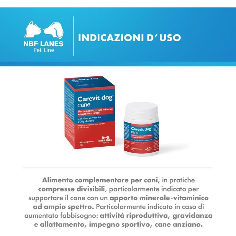 Carevit Dog Mangime Complementare per Cani è unalimento complementare formulato per contrastare le carenze vitaminiche e minerali nei cani. Indicato per soddisfare il fabbisogno maggiore di nutrienti in situazioni particolari, come alimentazioni casalinghe non bilanciate, cuccioli in crescita, cagne in gravidanza o allattamento, cani sportivi e anziani. Carevit Dog Mangime Complementare per Cani è un valido alleato nel supporto al trattamento di condizioni come dermatiti e ulcere, contribuendo a mantenere l'equilibrio nutrizionale e il benessere del tuo cane in ogni fase della vita.