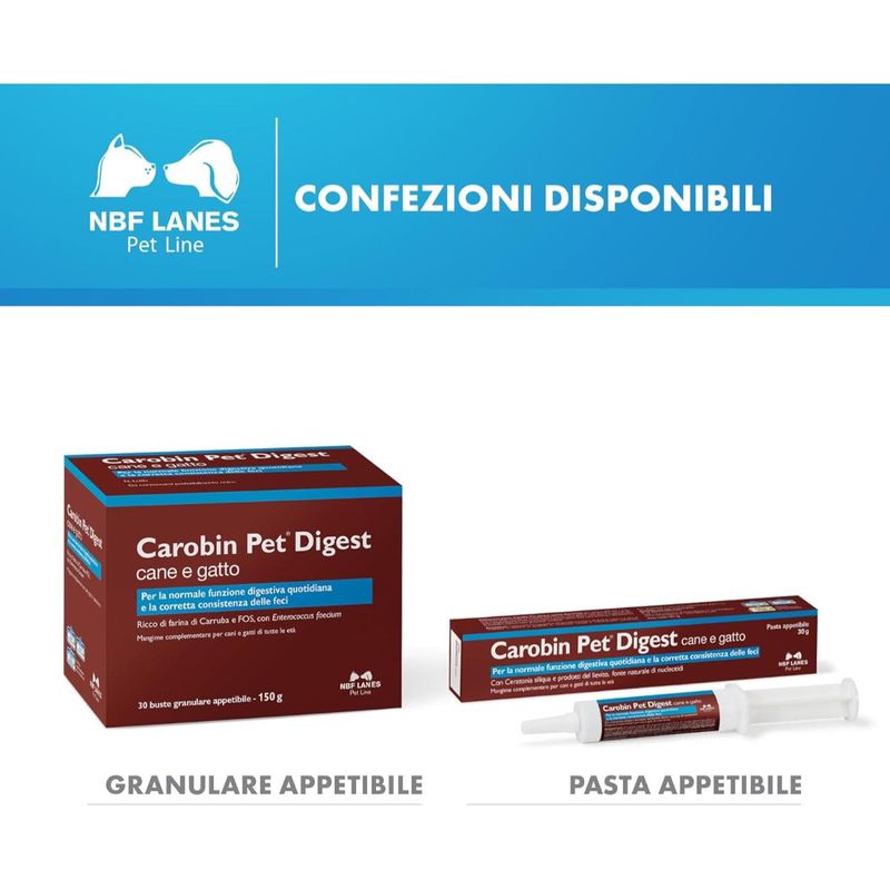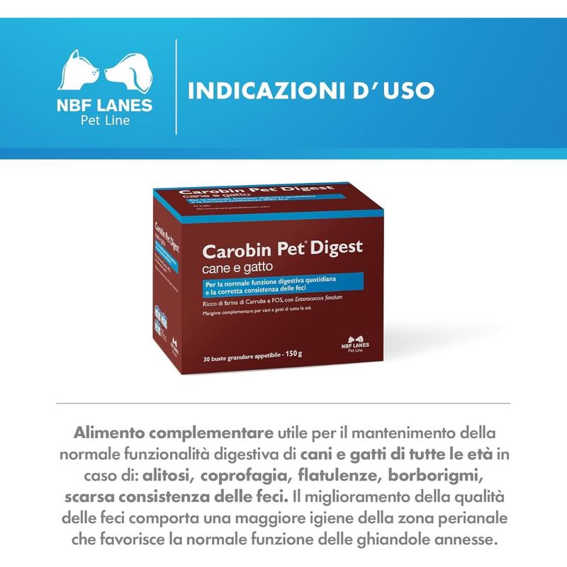 Carobin Pet Digest Granulare Appettibile Cane e Gatto è un mangime complementare formulato specificamente cani e gatti di tutte le età, utile per favorire la normale funzione digestiva quotidiana e migliorare la consistenza delle feci. Questo prodotto contiene farina di carruba, FOS (frutto-oligosaccaridi) ed Enterococcus faecium, ingredienti noti per il loro supporto alla salute intestinale. Grazie alla sua formulazione, Carobin Pet Digest può risultare utile per mantenere la funzionalità digestiva in diverse situazioni, come alitosi, coprofagia, flatulenza, borborigmi e feci poco consistenti. Il miglioramento della qualità delle feci porta anche a una maggiore igiene nella zona perianale, facilitando il corretto funzionamento delle ghiandole annesse. La farina di carruba, grazie al suo effetto meccanico, è in grado di assorbire acqua fino a 50 volte il suo peso, formando un gel che aiuta a distendere le pareti intestinali, stimolando la peristalsi e riducendo le contrazioni dolorose. I FOS supportano una migliore digeribilità dei nutrienti e contribuiscono a regolarizzare le feci, mentre l'Enterococcus faecium migliora i meccanismi di risposta immunitaria intestinale, sia a livello umorale che cellulare.