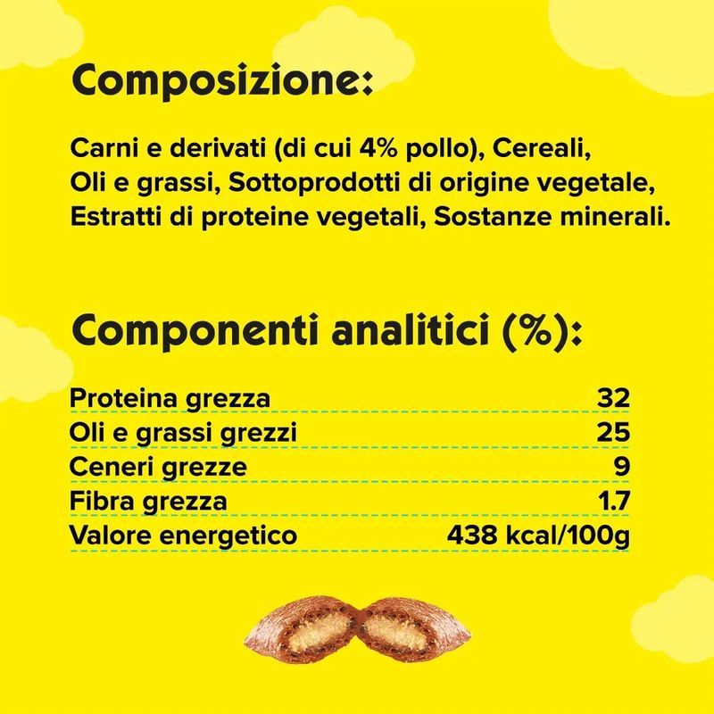 Catisfactions Snack per Gatto con Pollo è la scelta ideale per chi desidera viziare il proprio gatto in modo gustoso e sano. Perfetti per addestrarlo, ricompensarlo, arricchire i suoi pasti o semplicemente per trascorrere dei momenti di gioco insieme, questi snack offrono molteplici occasioni d’uso. È uno snack pensato per gatti adulti e gattini oltre le 8 settimane, un delizioso alimento complementare che unisce una croccantezza irresistibile a un ripieno cremoso che farà leccare i baffi al tuo felino. La formulazione è senza zuccheri aggiunti, né coloranti o aromi artificiali, offrendo così un’opzione sana e naturale per coccolare il tuo gatto. Inoltre questo snack è confezionato in un pratico pacchetto salva-freschezza, perfetti da portare sempre con te.