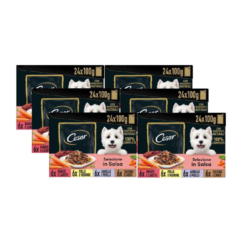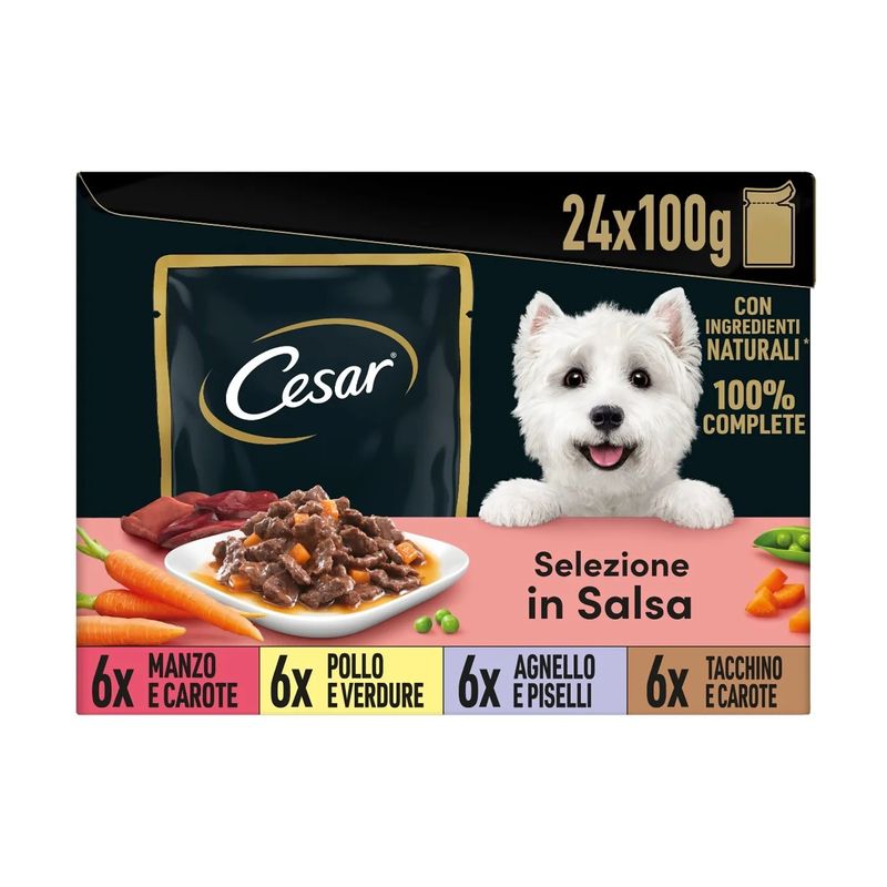 Cesar Dog Busta in Salsa Multipack 24x100G contengono proteine di ottima qualità a scelta tra pollo, manzo, tacchino, agnello con verdure conservati in salsa, per dare al tuo cane un pasto completo di proteine, vitamine e minerali con un gusto eccezionale. Tutte le ricette sono senza aromi, coloranti e conservanti artificiali. Le pratiche bustine ti permettono di variare l’alimentazione del tuo peloso ad ogni pasto, rendendolo ancora più interessante e goloso. Ogni busta contiene l’alimento completo e bilanciato studiato per i cani adulti, sono saporiti bocconcini conservati in una deliziosa salsa, perfetta anche per i palati più raffinati, nessun cane riuscirà a resistergli. Oltre alle proteine di prima scelta ogni bustina contiene anche fonti di verdure e cereali, per garantire al tuo peloso tutti i nutrienti di cui ha bisogno, così da garantirgli una dieta sana ed equilibrata. Il formato in busta è comodo se dovete fare un viaggio oppure una gita fuori porte, avrete sempre con voi un alimento sano da offrire al vostro amico peloso, anche fuori casa.
