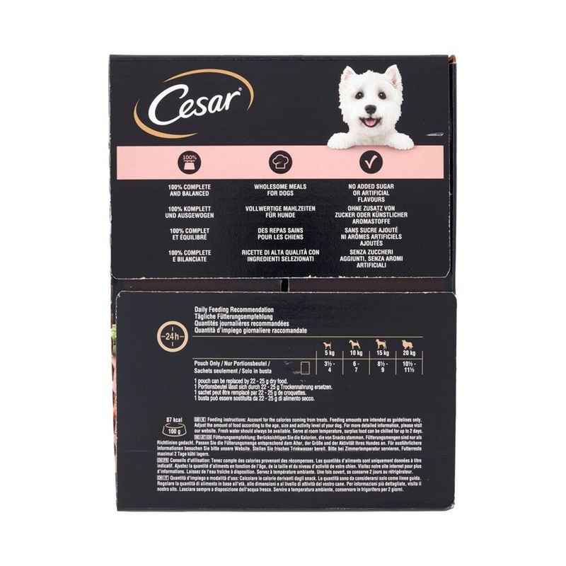 Cesar ha formulato deliziosi pasti realizzati con ingredienti scelti, senza l’aggiunta di aromi, coloranti e conservanti artificiali, per garantire tutti i nutrienti di cui ha bisogno con tutto il gusto e il sapore delle materie prime. I pezzi teneri e appetitosi e le vere verdure croccanti contengono 26 nutrienti chiave per il benessere fisico di Fido.