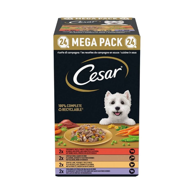 Fai felice il tuo cane con Cesar Dog Ricette di Campagna Vaschetta Multipack 24X150G, un pasto equilibrato e gustoso per ogni giorno!