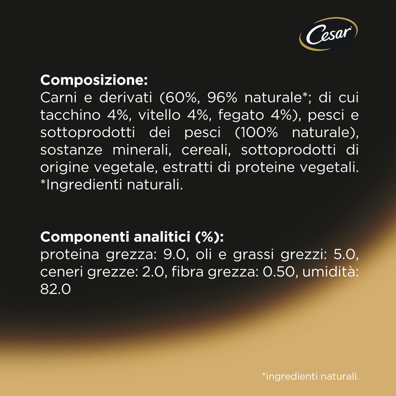 Cesar ha formulato deliziosi pasti realizzati con ingredienti scelti, senza l’aggiunta di aromi, coloranti e conservanti artificiali, per garantire tutti i nutrienti di cui ha bisogno con tutto il gusto e il sapore delle materie prime. I pezzi teneri e appetitosi e le vere verdure croccanti contengono 26 nutrienti chiave per il benessere fisico di Fido.