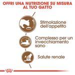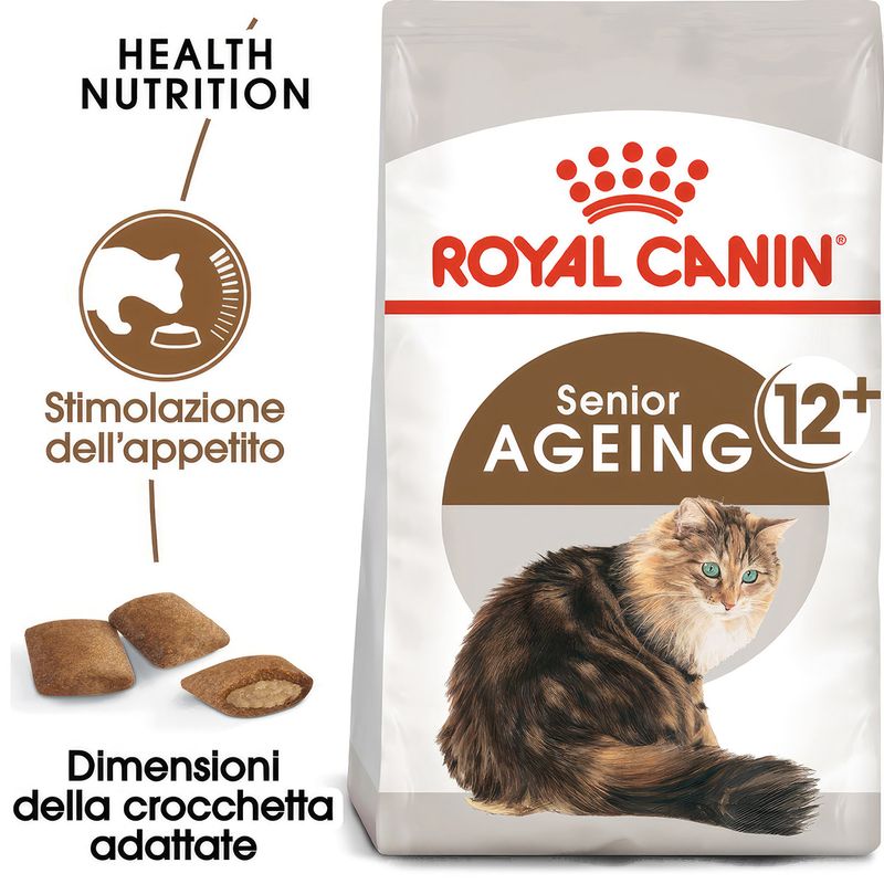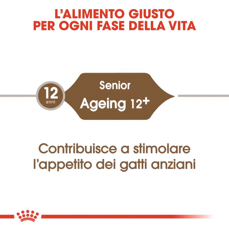 Royal Canin Cat Ageing +12 Alimento Completo per Gatti Anziani di Oltre 12 Anni di Età è formulato appositamente per rispondere alle esigenze nutrizionali dei gatti anziani. Con un apporto calorico adattato e un moderato contenuto di grassi, contribuisce al mantenimento del peso forma dei gatti anziani. Il progressivo declino del senso del gusto e dell’olfatto, in alcuni gatti anziani, può indurre una riduzione della quantità di cibo ingerito, per questo sono estremamente appetibili e caratterizzate da una doppia consistenza (croccante fuori, morbida dentro), che aiuta a stimolare l’appetito dei gatti anziani. I nutrienti specifici (triptofano, EPA-DHA ed un complesso di antiossidanti tra cui licopene e beta-carotene) contribuiscono a limitare le conseguenze legate al naturale processo di invecchiamento sulla funzione cognitiva, sulla mobilità e sullo stress ossidativo. Seguire una dieta equilibrata è più agevole per il tuo peloso quando il cibo rispecchia le sue preferenze naturali. Formulato per rispettare il profilo macro-nutrizionale istintivamente preferito dai pelosi, promuovendo così il consumo del pasto e l'assunzione degli elementi nutritivi essenziali per la salute. Inoltre, grazie a quantità adeguate di sali minerali, come il contribuisce al mantenimento della salute del sistema urinario.