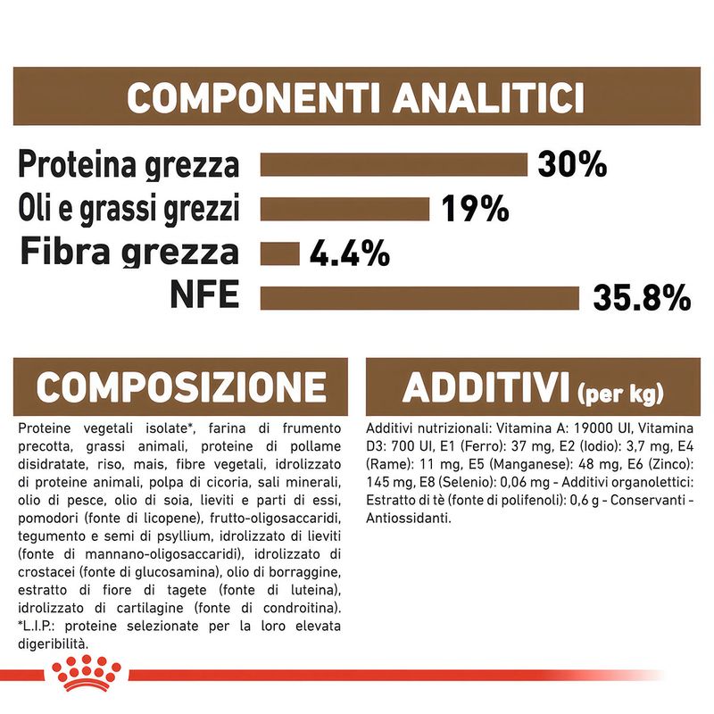 Gli alimenti Royal Canin si distinguono per la loro precisione nutrizionale, evidente in ogni aspetto, dalla forma e dimensione delle crocchette alle diverse consistenze e appetibilità degli alimenti umidi. L'approccio distintivo di Royal Canin è basato su una nutrizione su misura, precisa e completa, offrendo diverse gamme di alimenti completi progettati per soddisfare specifici bisogni legati all'età, alla taglia, alla razza o a particolari sensibilità del tuo amico a quattro zampe. Ciascuna formula è appositamente sviluppata per fornire un livello adattato di nutrienti strategici, come antiossidanti, vitamine, fibre, prebiotici e sali minerali, al fine di promuovere la salute di ogni animale domestico.