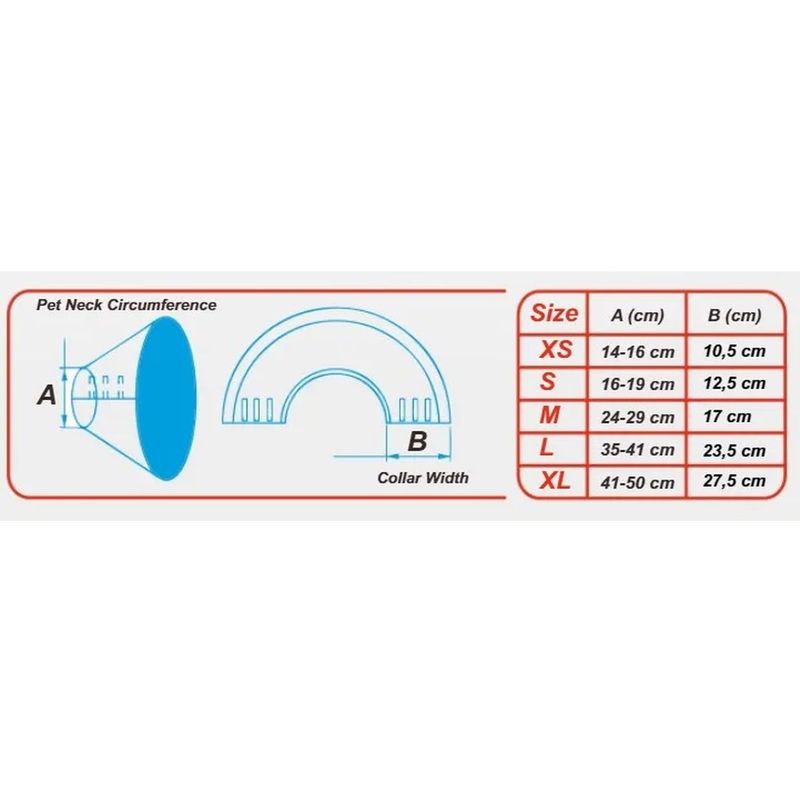 N.B. Il prodotto è disponibile in quest’unica colorazione, nelle seguenti misure dove la A è la circonferenza del collo dell'animale domestico, e la B la larghezza del collare: XS: A (14-16cm), B (10,5cm); S: A (16-19cm) B (12,5cm); M: A (24-29cm), B (17cm); L: A (35-41cm), B (23,5cm); XL: A (41-50cm), B (27,5cm).