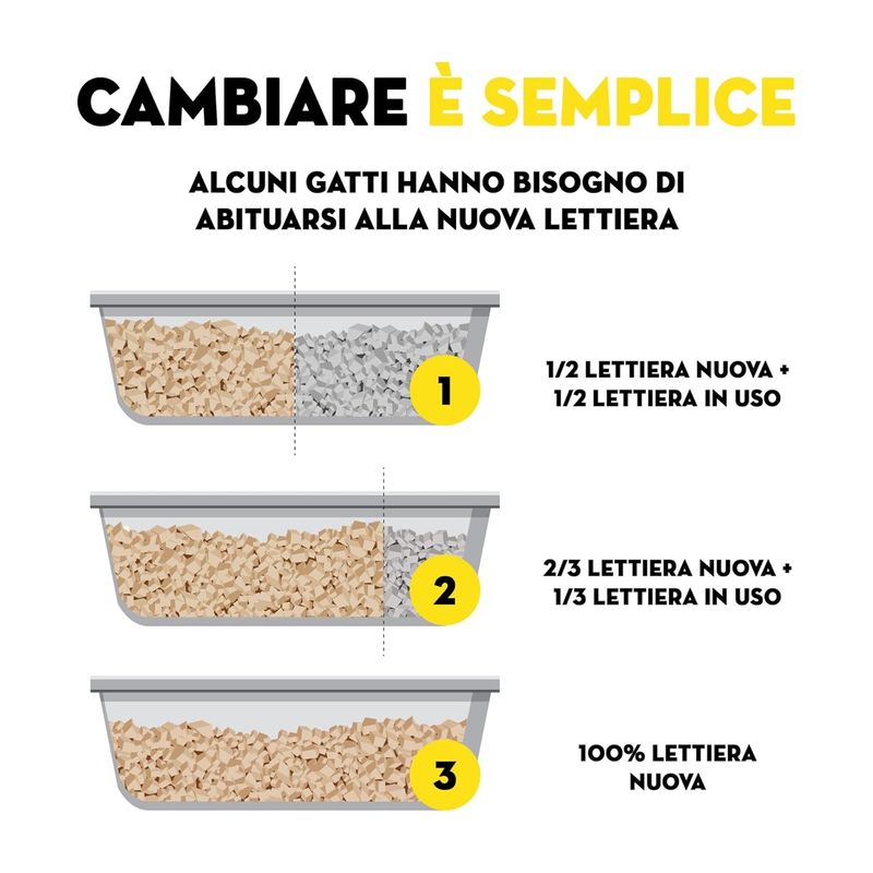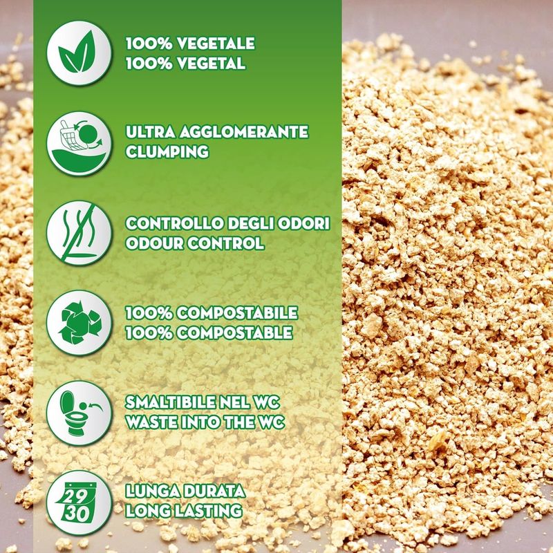 La sabbia è composta da speciali fibre vegetali provenienti principalmente da coltivazioni locali, rendendola altamente Ecocompatibile. Queste fibre sono altamente assorbenti e agglomeranti, permettendo una pulizia efficiente della lettiera. Ha un’azione molto efficace grazie al suo alto potere assorbente che neutralizza gli odori, permettendo la formazione immediata di piccole palle facili da rimuovere, mantenendo la lettiera pulita e fresca più a lungo. La sua particolare composizione fa sì che non si attacca alle zampette del tuo amico peloso evitando così di rigare i pavimenti di casa.