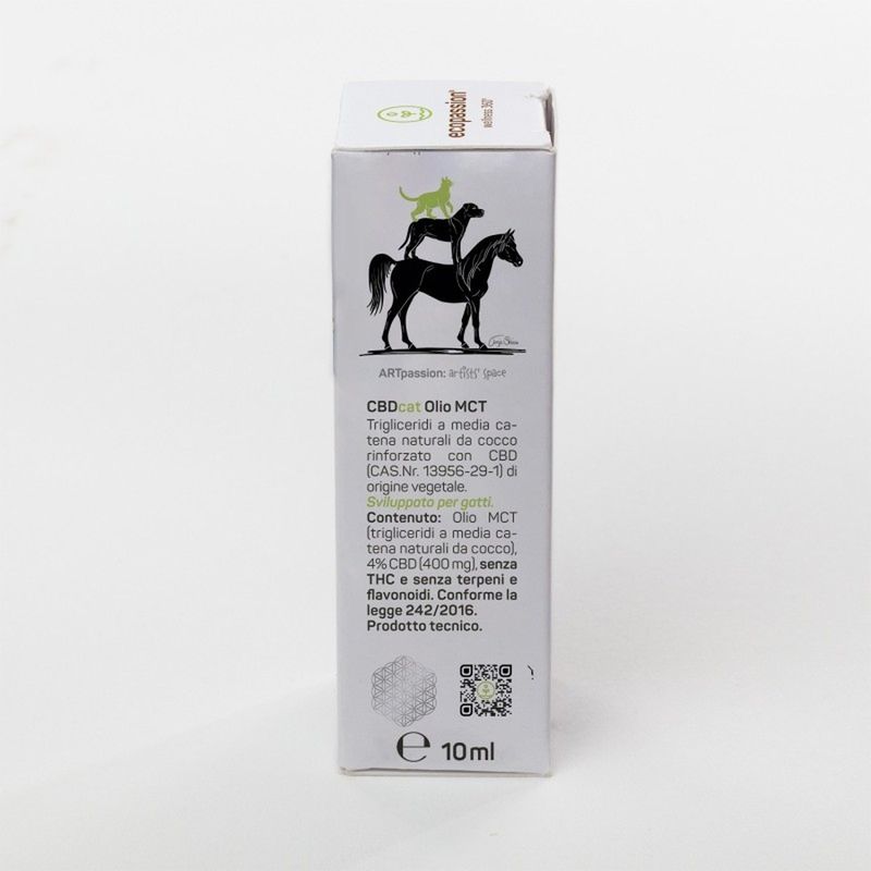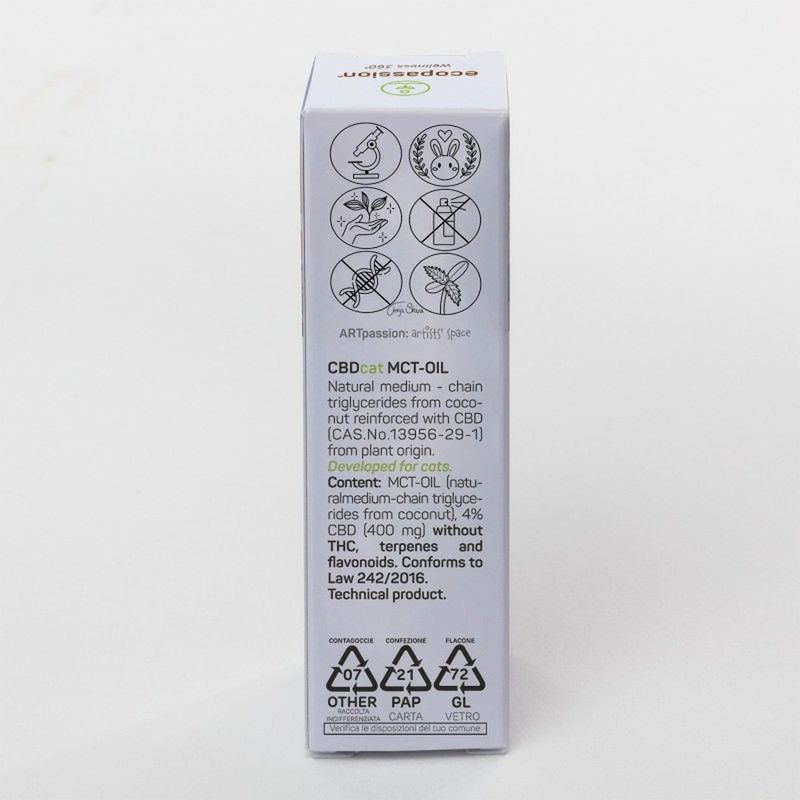 Il Ecopassion Olio Complementare CBD per Gatti è un olio complementare sviluppato appositamente per gatti di ogni età, anche quelli più sensibili. Si tratta di un MCT-Oil, ovvero un olio a base di trigliceridi a media catena derivati dal cocco, arricchito con il 4% di CBD isolato di origine vegetale. Il suo effetto naturale e delicato favorisce l’equilibrio del sistema nervoso, aiuta a modulare la risposta comportamentale e dona sollievo in caso di stress o sensibilità cutanea. Il CBD, noto per le sue proprietà lenitive, antiossidanti ed equilibranti, sostiene la rigenerazione cutanea, protegge dalle aggressioni esterne e migliora l’aspetto della pelle. L’olio è senza THC, senza terpeni e flavonoidi, ed è inodore, incolore e non grasso, per un’assunzione semplice e sicura anche nei gatti più schizzinosi.