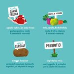 La formula ipoallergenica è stata attentamente elaborata con l'intento di soddisfare anche i cani con stomaci sensibili. Per questo motivo, sono stati inclusi prebiotici che favoriscono una sana digestione e il benessere intestinale del tuo amico a quattro zampe. Per arricchire ulteriormente la dieta del tuo peloso, è stata introdotta una varietà di frutta e verdure, ma anche un nutriente mix di erbe aromatiche che apportano preziosi nutrienti e un gusto delizioso. La filosofia di preparazione prevede un metodo di cottura lento e attento, che preserva al massimo la freschezza e la bontà naturale degli ingredienti. Questo assicura che le crocchette mantengano intatto il loro sapore delizioso e le proprietà nutritive essenziali per una dieta equilibrata.