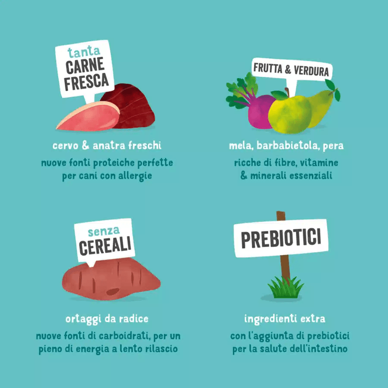 • Fonte proteica: carne fresca di cervo e anatra allevata a terra.