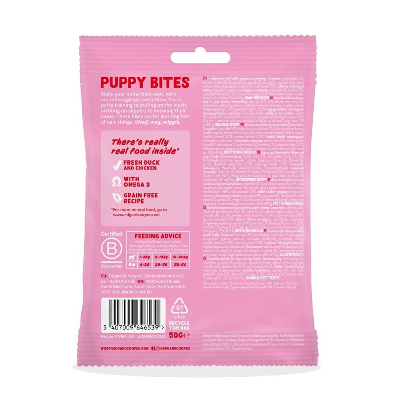 Con Edgard&Cooper Snack Puppy Small Bites Anatra e Pollo, stai investendo nel benessere e nella felicità del tuo fedele amico, un morso alla volta.