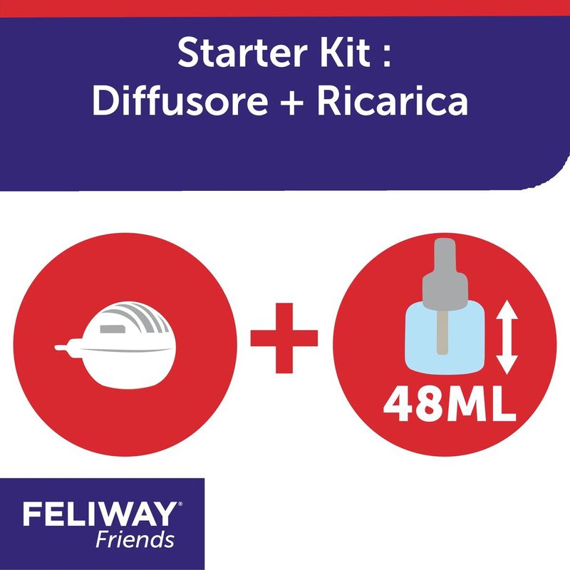 I feromoni sono sostanze chimiche naturali che gli animali rilasciano per comunicare con i loro simili. Feliway Friends utilizza feromoni sintetici, simili a quelli rilasciati dalla ghiandola facciale dei gatti durante momenti di rilassamento e benessere. Questi feromoni aiutano a ridurre i conflitti e le tensioni tra i gatti che convivono, creando un'atmosfera più pacifica in casa. Il Feliway Friends Starter Kit è estremamente facile da utilizzare: basta inserire il diffusore in una presa elettrica in una zona centrale della casa, dove i gatti trascorrono la maggior parte del tempo. Una volta attivato, il diffusore rilascerà gradualmente i feromoni nell'aria, diffondendoli efficacemente in tutta l'area domestica. Coprendo fino a 70 m2, il kit è adatto alla maggior parte delle abitazioni domestiche, garantendo una distribuzione uniforme dei feromoni in tutte le stanze. Ogni ricarica dura fino a 30 giorni, assicurando un effetto costante nel tempo. Questo significa che i feromoni saranno sempre presenti nell'ambiente domestico, mantenendo un'atmosfera tranquilla e armoniosa per i gatti conviventi.