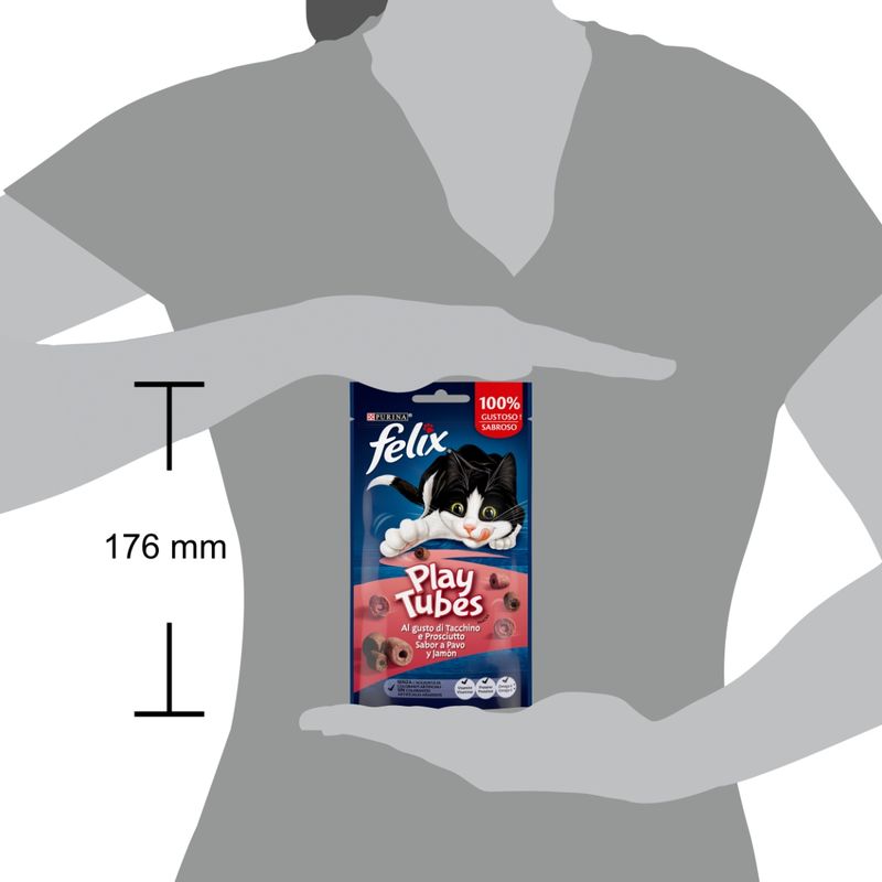 Rendi ogni gioco ancora più divertente con Felix Cat Playtubes Snack con Tacchino e Prosciutto: lanciane uno e guarda il tuo gatto inseguire il gusto!