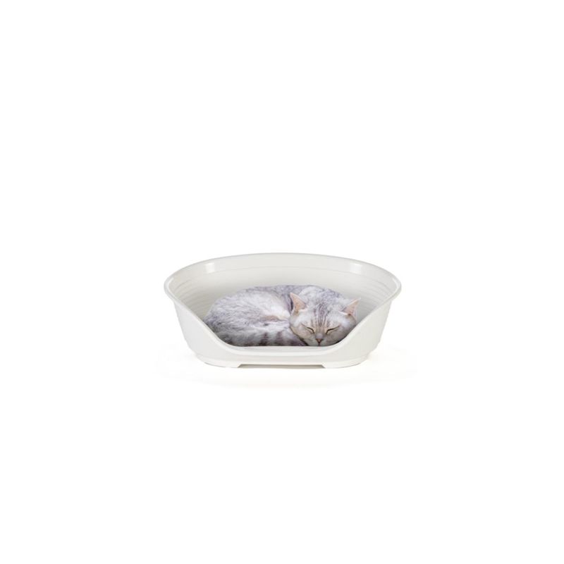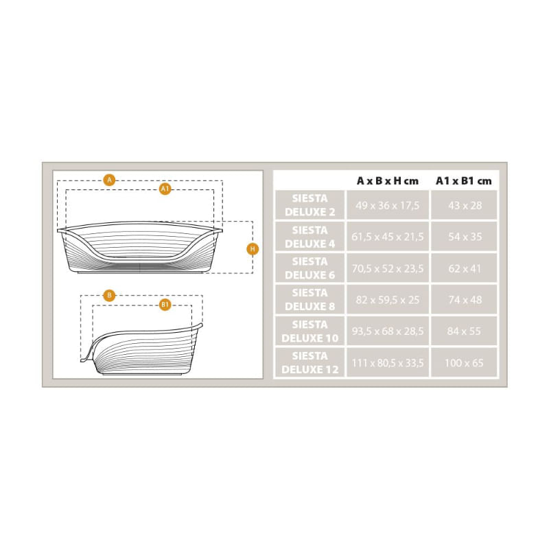 Scoprite la comfortevole cuccia da interno Siesta Deluxe Bianco per cani e gatti realizzata in solida resina termoplastica! Siesta Deluxe è un prodotto che rispetta l'ambiente, realizzato con materiali provenienti da riciclo industriale e post-consumo. Contribuendo alla salvaguardia dell'ambiente, Siesta Deluxe si impegna a offrire comfort e qualità senza compromettere il futuro delle nostre risorse naturali. Il suo design presenta forme arrotondate con bordi alti e confortevoli, un lato frontale ribassato per un comodo poggiamento dell'animale e piedini con antiscivolo per una stabilità ottimale. Il fondo è perforato per garantire un corretto passaggio dell'aria, assicurando comfort e freschezza.