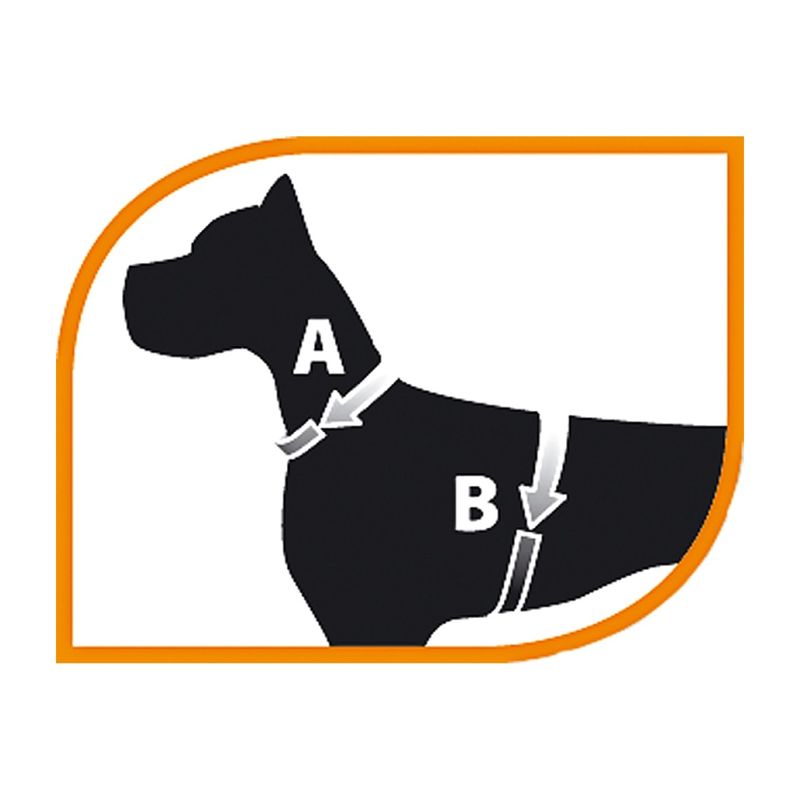 Per trovare la misura più adatta, misura con precisione la circonferenza sottopancia (misura B) e quella del girocollo (misura A) del tuo cane.