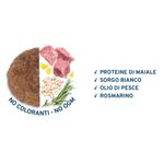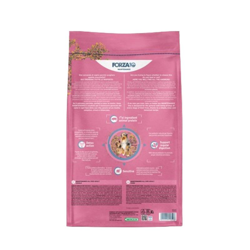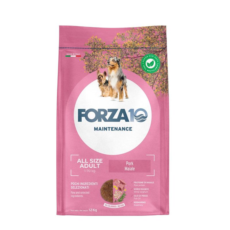 Forza10 All Breeds Maintenance Maiale è un alimento secco completo per cani adulti di tutte le taglie, offrendo una fonte proteica di ottimo valore biologico facilmente assimilabile. Questo mangime è privo di coloranti artificiali e ingredienti geneticamente modificati, garantendo un'alimentazione naturale e di alta qualità per il tuo cane. Questo alimento contiene carne di maiale come fonte principale di proteine animali, ricca di aminoacidi ramificati fondamentali per il mantenimento dei cani sensibili, sorgo bianco, olio di pesce e rosmarino, selezionati con cura per offrire al tuo cane un alimento nutriente e gustoso. Con la funzione Detox Action offri al tuo cane una pulizia naturale e efficace, eliminando le tossine che possono compromettere la sua salute a lungo termine, infatti la clinoptilolite agisce come una spugna, attirando e catturando tossine e impurità presenti nell'organismo del tuo cane. Questo processo di assorbimento aiuta a purificare il corpo del tuo animale domestico, contribuendo alla sua salute generale e al suo benessere. Inoltre, è arricchito con prebiotici naturali che favoriscono una corretta peristalsi intestinale e supportano la salute digestiva del tuo animale domestico.