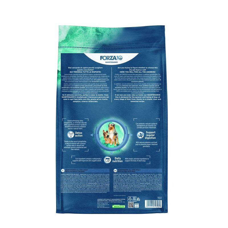 Con Forza10 All Size Adult Maintenance Pesce con Riso, offri al tuo cane un'alimentazione di qualità che rispetta le sue esigenze nutrizionali e favorisce il suo benessere generale.
