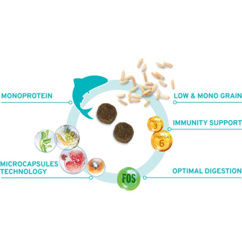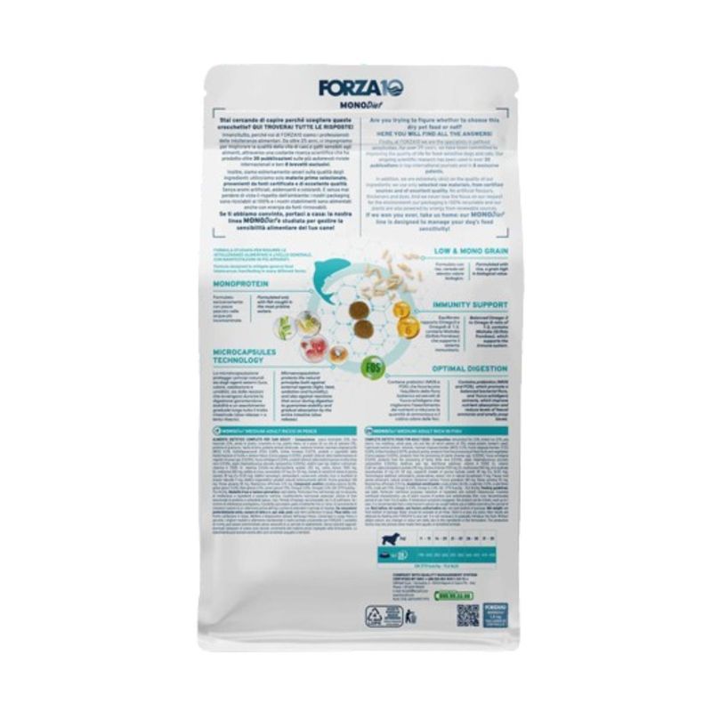Forza10 MonoDiet Medium Dog Pesce è un alimento secco completo e dietetico progettato appositamente per cani adulti di taglia media. La sua formula ipoallergenica è studiata per ridurre le intolleranze alimentari a livello generale, con manifestazioni in più apparati, garantendo una nutrizione completa e bilanciata per il tuo animale domestico. Questo alimento contiene esclusivamente il pesce, proveniente da acque incontaminate, come fonte proteica di alta qualità e nutrizionalmente bilanciata e riso, cereale ad elevato valore biologico, che contribuisce a una dieta equilibrata. La microincapsulazione protegge i principi naturali dall'esposizione agli agenti esterni e durante la digestione, garantendo un assorbimento graduale e stabile lungo tutto il tratto intestinale. Inoltre, contiene un equilibrato rapporto di acidi grassi Omega-3 e Omega-6, arricchito con Maitake (Grifola frondosa) per sostenere il sistema immunitario del tuo cane e prebiotici MOS e FOS che promuovono l'equilibrio della flora batterica e estratti di Yucca schidigera che migliorano l'assorbimento dei nutrienti e riducono il cattivo odore delle feci.