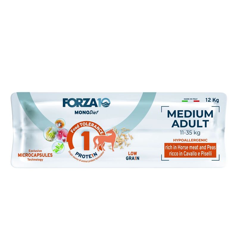 Forza10 MonoDiet Medium Dog Cavallo e Piselli è un alimento dietetico completo progettato appositamente per cani adulti di taglia media. La sua formula ipoallergenica è studiata per ridurre le intolleranze alimentari a livello generale, con manifestazioni in più apparati, garantendo una nutrizione completa e bilanciata per il tuo animale domestico. Questo alimento è monoproteico cioè contiene esclusivamente la carne di cavallo, in carne rossa , come fonte proteica di alta qualità La carne di cavallo è una fonte proteica alternativa di alta qualità, facilmente digeribile e nutrizionalmente bilanciata, il che la rende particolarmente indicata per cani sensibili o con intolleranze alimentari. La sua composizione include anche cereali ancestrali ad elevato valore biologico come riso e sorgo bianco.