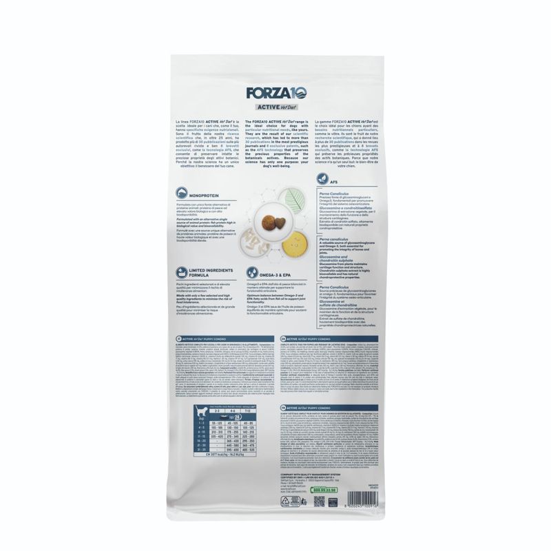Forza10 Puppy Active Vet Diet Condro con Pesce è un alimento secco dietetico completo, appositamente formulato per cuccioli e cagne in gravidanza o in allattamento, progettato per supportare il metabolismo articolare e garantire uno sviluppo sano delle articolazioni. Questo mangime è realizzato con un'unica fonte alternativa di proteine animali, derivante da pesce di elevato valore biologico e alta biodisponibilità, per garantire un'alimentazione ottimale e minimizzare il rischio di intolleranze alimentari. La formula è arricchita con la tecnologia AFS Tablet, che include Perna Canaliculus, una preziosa fonte di glicosaminoglicani e Omega-3, essenziali per mantenere l'integrità del sistema osteoarticolare. Inoltre, contiene glucosamina di estrazione vegetale e condroitin solfato, elementi fondamentali per il mantenimento della funzione e della struttura della cartilagine. Il condroitin solfato, altamente biodisponibile, offre naturali proprietà condroprotettive per un'efficace protezione delle articolazioni. La presenza di Omega-3 ed EPA provenienti dall'olio di pesce è bilanciata in modo ottimale per supportare la funzionalità articolare, riducendo ulteriormente l'infiammazione e promuovendo la salute delle articolazioni.