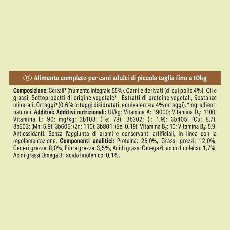 • Arricchito con verdure, cereali integrali, vitamine del gruppo B e acidi grassi Omega 3 e 6.