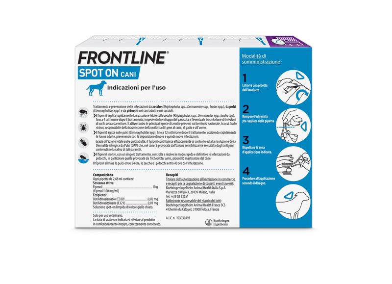Prodotto idoneo per il trattamento e la prevenzione delle infestazioni da zecche, pulci e pidocchi. Utilizzabili nelle cagne in gravidanza e allattamento. Applicabile sui cuccioli a partire dalle 8 settimane di vita e/o di peso superiore ai 2Kg.