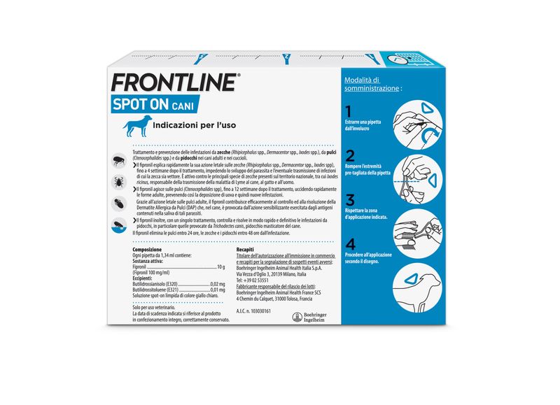 Prodotto idoneo per il trattamento e la prevenzione delle infestazioni da zecche, pulci e pidocchi. Utilizzabili nelle cagne in gravidanza e allattamento. Applicabile sui cuccioli a partire dalle 8 settimane di vita e/o di peso superiore ai 2Kg.