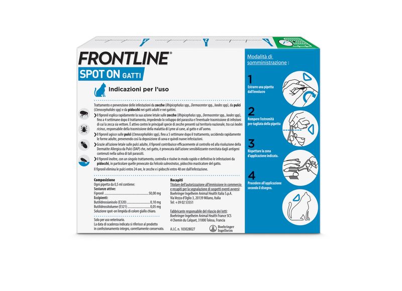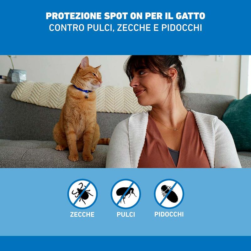 Prodotto idoneo per il trattamento e la prevenzione delle infestazioni da zecche, pulci e pidocchi. Utilizzabile nelle gatte in gravidanza e allattamento. Applicabile sui gattini a partire dalle 8 settimane di vita e/o di peso superiore a 1Kg.