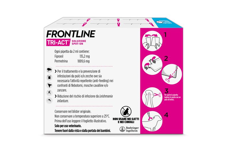 AvvertenzeTenere fuori dalla vista e dalla portata dei bambini. Non usare nei gatti o nei conigli, poiché potrebbero verificarsi reazioni avverse potenzialmente mortali. Non usare in casi di ipersensibilità ai principi attivi o ad uno degli eccipienti. Non usare questo medicinale veterinario dopo la data di scadenza riportata sulla scatola dopo “EXP/SCAD”. La data di scadenza si riferisce all’ultimo giorno del mese. Il prodotto mantiene l’efficacia quando gli animali trattati sono sottoposti ad immersioni occasionali in acqua (ad esempio, nuoto, bagni). Tuttavia si consiglia di non lavare o permettere ai cani di nuotare nelle 48 ore successive al trattamento.