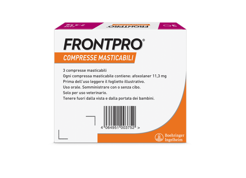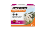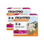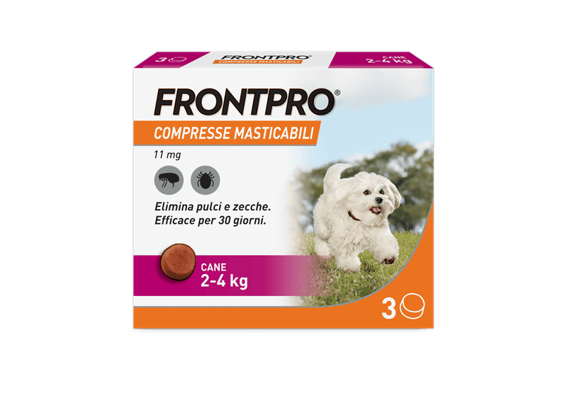 Consigli utiliProdotto di facile somministrazione, idoneo per il trattamento delle infestazioni da pulci nei cani, per almeno 5 settimane e delle infestazioni da zecche nei cani, per un mese. FRONTPRO elimina le pulci entro 8 ore e le zecche entro 48 ore dalla somministrazione. Il prodotto elimina le pulci prima che producano le uova prevenendo quindi la contaminazione della casa. Utilizzabile nelle cagne in gravidanza e allattamento. Applicabile sui cuccioli a partire dalle 8 settimane di vita e/o di peso superiore ai 2Kg. Disponibile senza ricetta veterinaria.