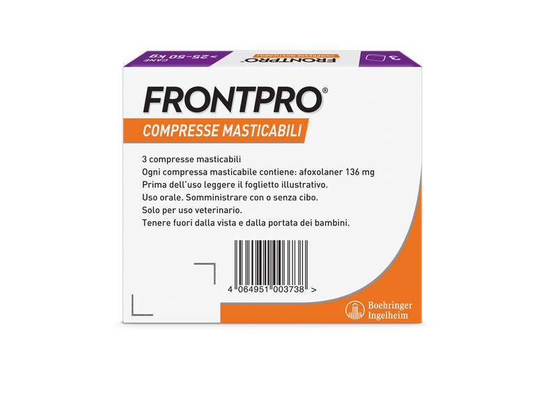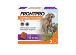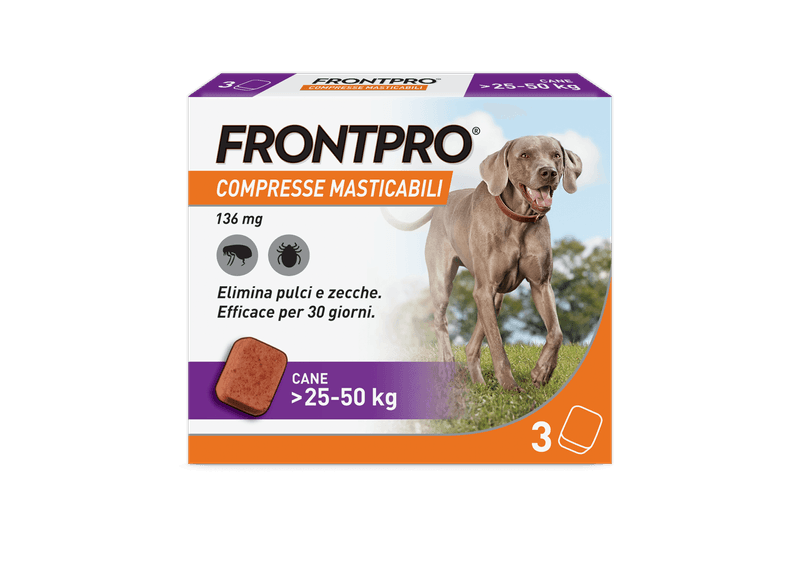 Prodotto di facile somministrazione, idoneo per il trattamento delle infestazioni da pulci nei cani, per almeno 5 settimane e delle infestazioni da zecche nei cani, per un mese. FRONTPRO elimina le pulci entro 8 ore e le zecche entro 48 ore dalla somministrazione. Il prodotto elimina le pulci prima che producano le uova prevenendo quindi la contaminazione della casa. Utilizzabile nelle cagne in gravidanza e allattamento. Applicabile sui cuccioli a partire dalle 8 settimane di vita e/o di peso superiore ai 2Kg. Disponibile senza ricetta veterinaria.