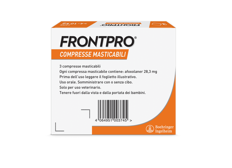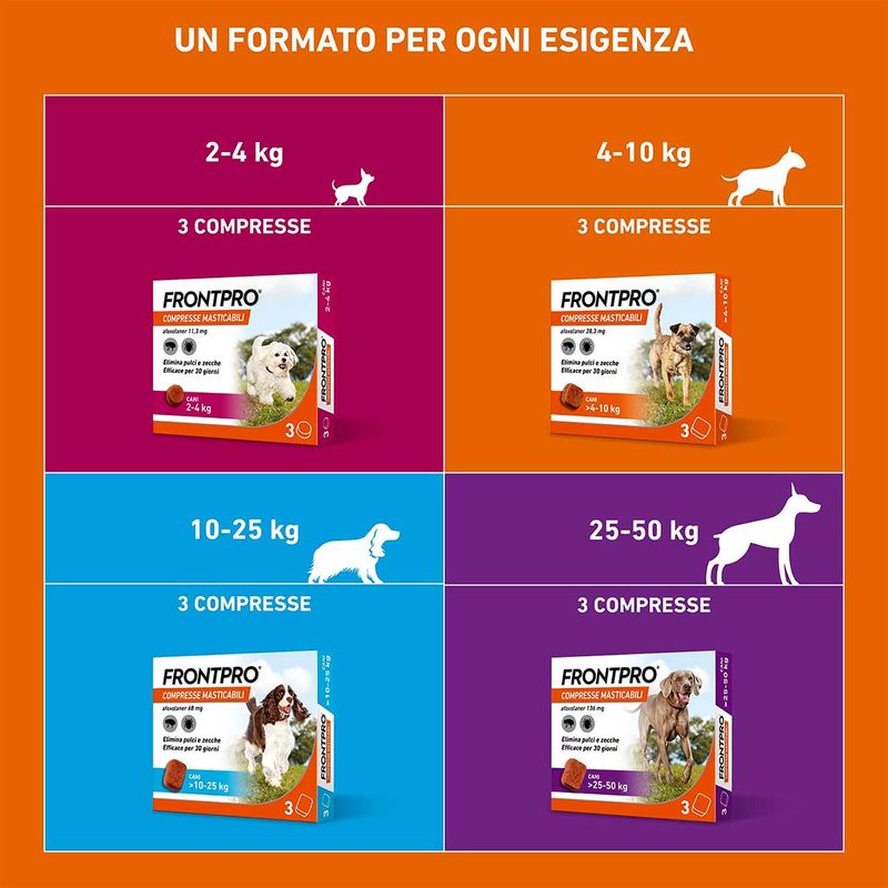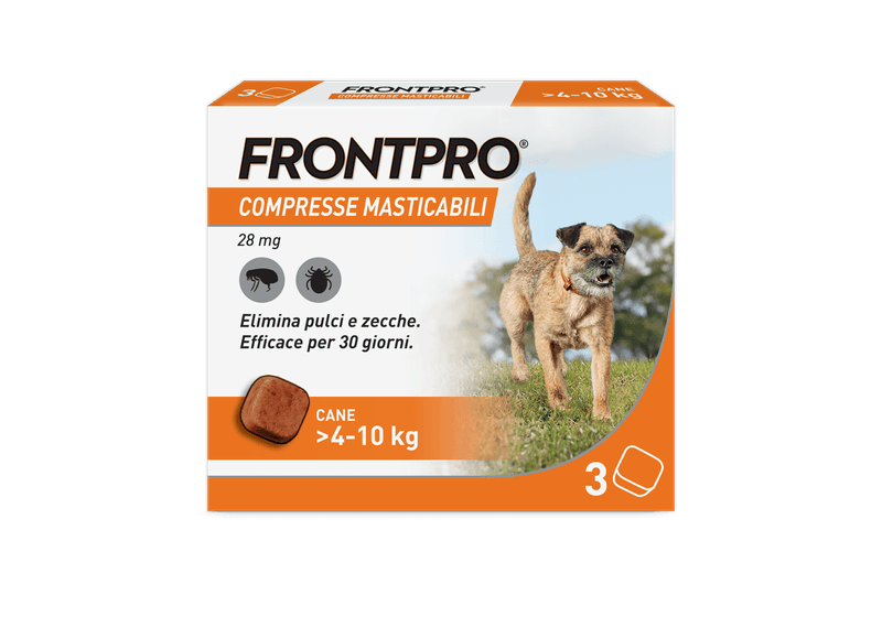 Prodotto di facile somministrazione, idoneo per il trattamento delle infestazioni da pulci nei cani, per almeno 5 settimane e delle infestazioni da zecche nei cani, per un mese. FRONTPRO elimina le pulci entro 8 ore e le zecche entro 48 ore dalla somministrazione. Il prodotto elimina le pulci prima che producano le uova prevenendo quindi la contaminazione della casa. Utilizzabile nelle cagne in gravidanza e allattamento. Applicabile sui cuccioli a partire dalle 8 settimane di vita e/o di peso superiore ai 2Kg. Disponibile senza ricetta veterinaria.