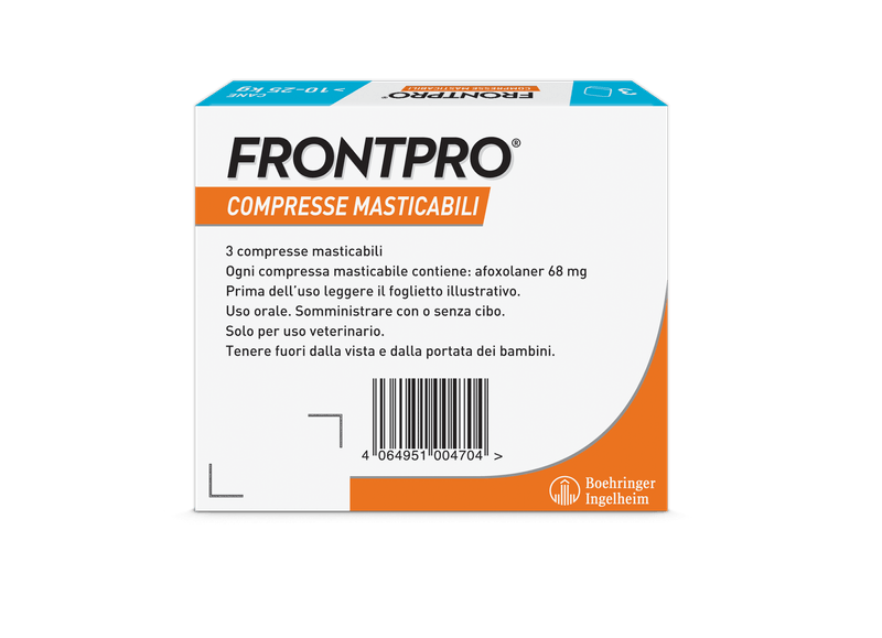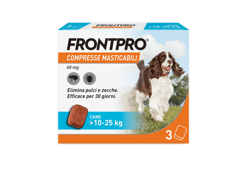 Consigli utiliProdotto di facile somministrazione, idoneo per il trattamento delle infestazioni da pulci nei cani, per almeno 5 settimane e delle infestazioni da zecche nei cani, per un mese. FRONTPRO elimina le pulci entro 8 ore e le zecche entro 48 ore dalla somministrazione. Il prodotto elimina le pulci prima che producano le uova prevenendo quindi la contaminazione della casa. Utilizzabile nelle cagne in gravidanza e allattamento. Applicabile sui cuccioli a partire dalle 8 settimane di vita e/o di peso superiore ai 2Kg. Disponibile senza ricetta veterinaria.