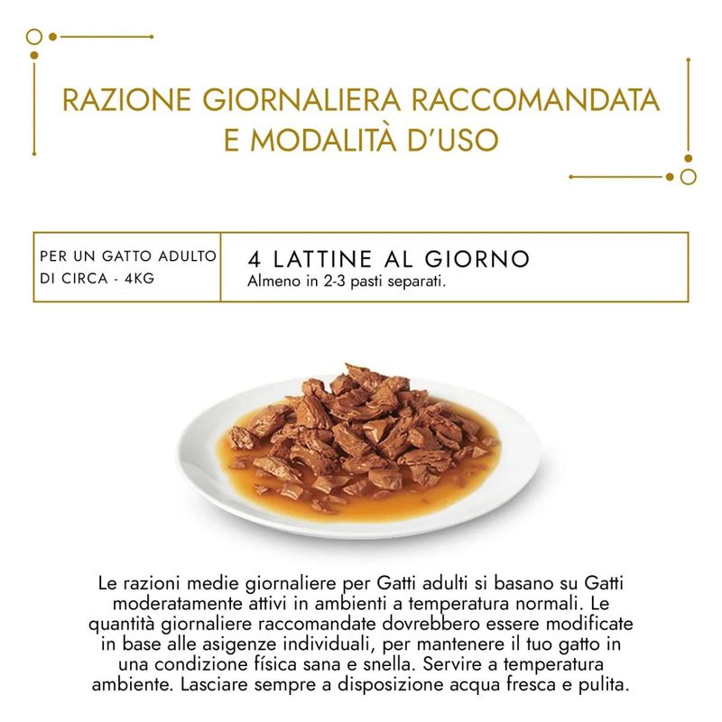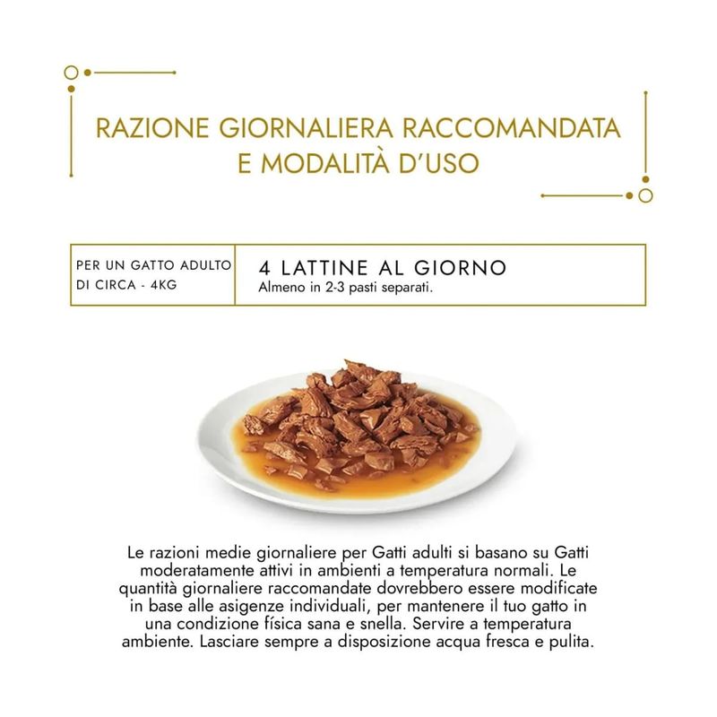 N.B. Il prodotto è disponibile in formato lattina multipack da 48x85G al gusto Mix Carne e Pesce e contiene 12 lattine al gusto Tonno in una salsa al gusto di Frutti di Mare, 12 lattine al gusto Manzo in una salsa al gusto di Manzo Arrosto, 12 lattine al gusto Salmone in una salsa al gusto Salmone Scottato, 12 lattine al gusto Pollo in una salsa al gusto Pollo Grigliato. Il multipack 96x85G contiene 24 lattine per ognuno dei gusti sopraindicati.